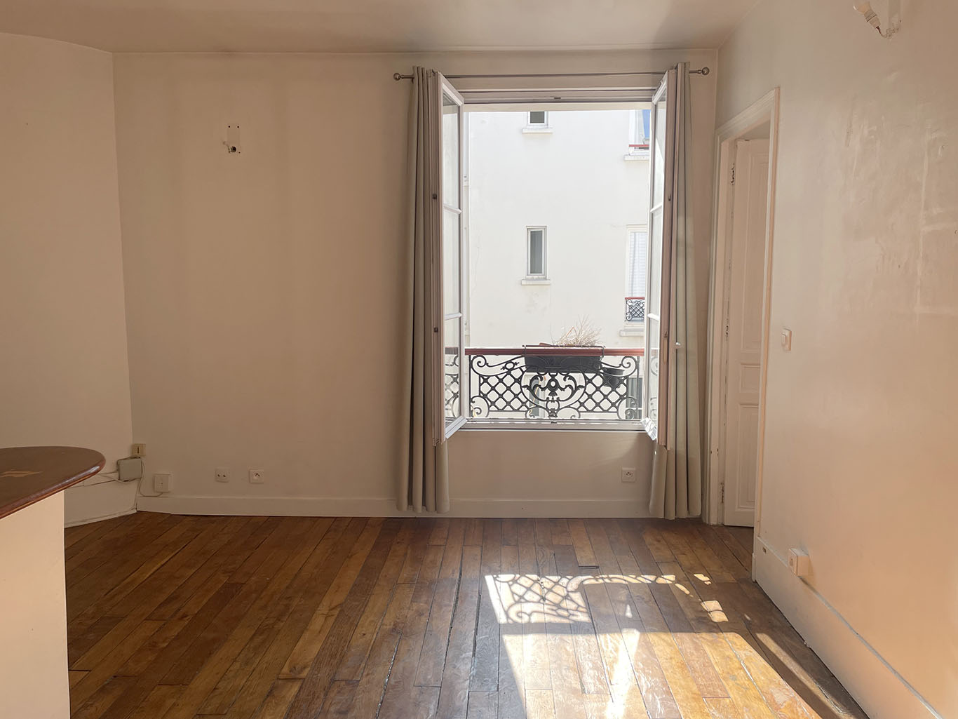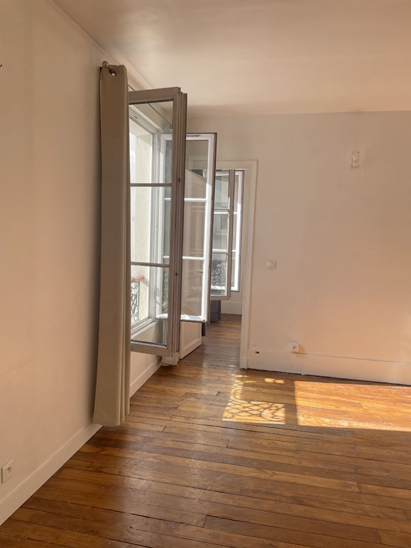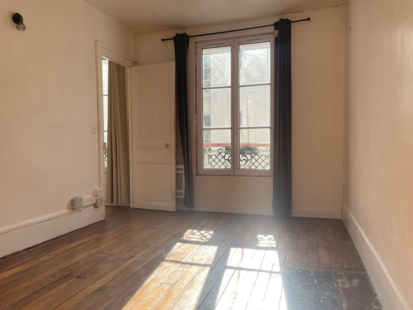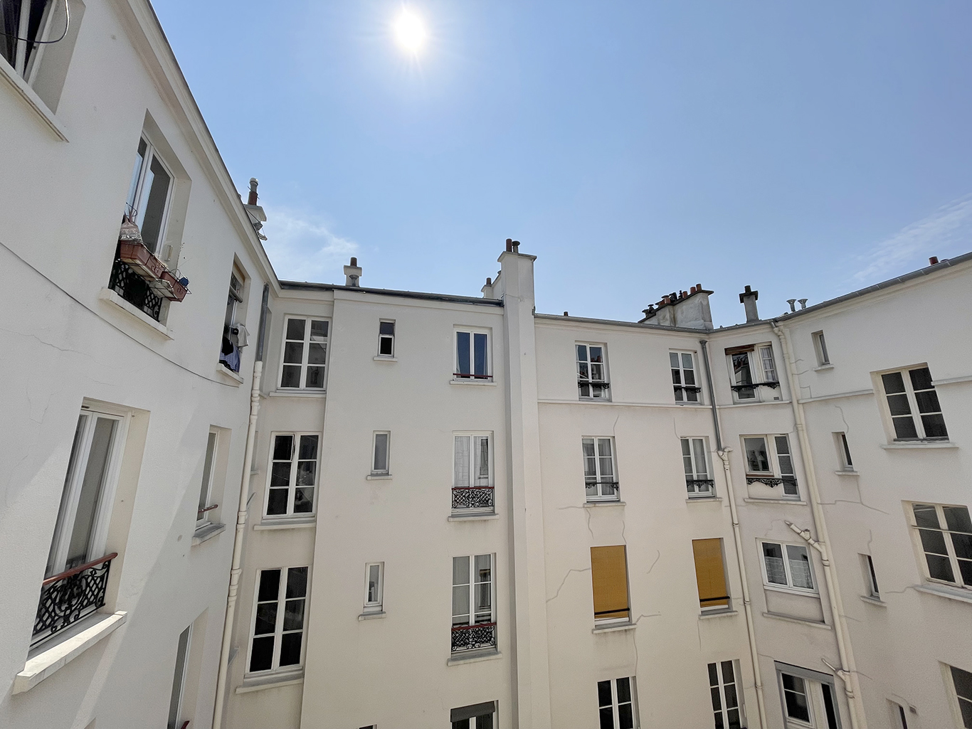 Paris 18ème. Métro Abbesses. Rue des Abbesses. Agréable 2 pièces de 40,47 m2 loi Carrez exposé plein Sud sur cour au calme. 5ème étage sans ascenseur. Entrée (avec fenêtre), séjour avec cuisine Us de 18,19 m2, belle chambre de 13,80 m2, salle de bains (avec fenêtre), wc séparés avec lave-mains (avec fenêtre). Parquet chêne ancien. Double vitrage pvc dans tout l’appartement. Chauffage électrique. Cave saine en terre battue. L’appartement est à rénover. Local vélos. DPE : E328 & B10.