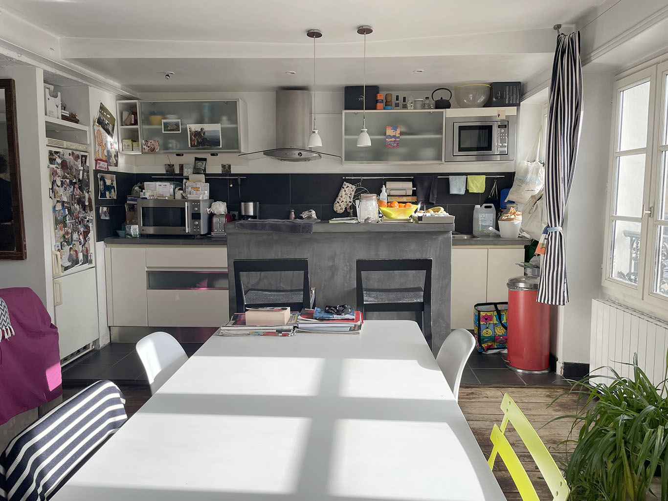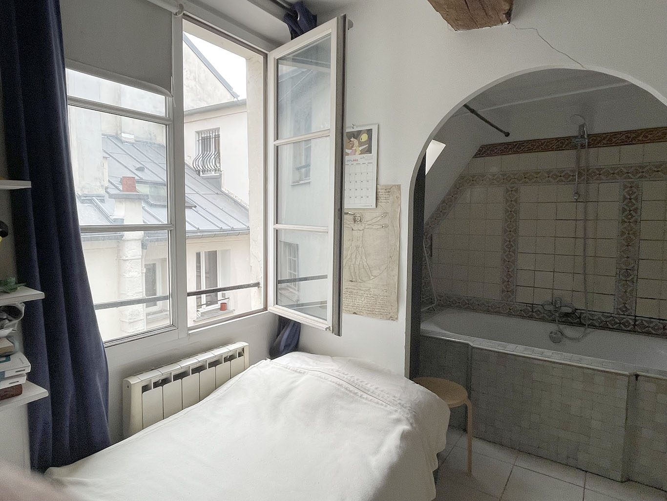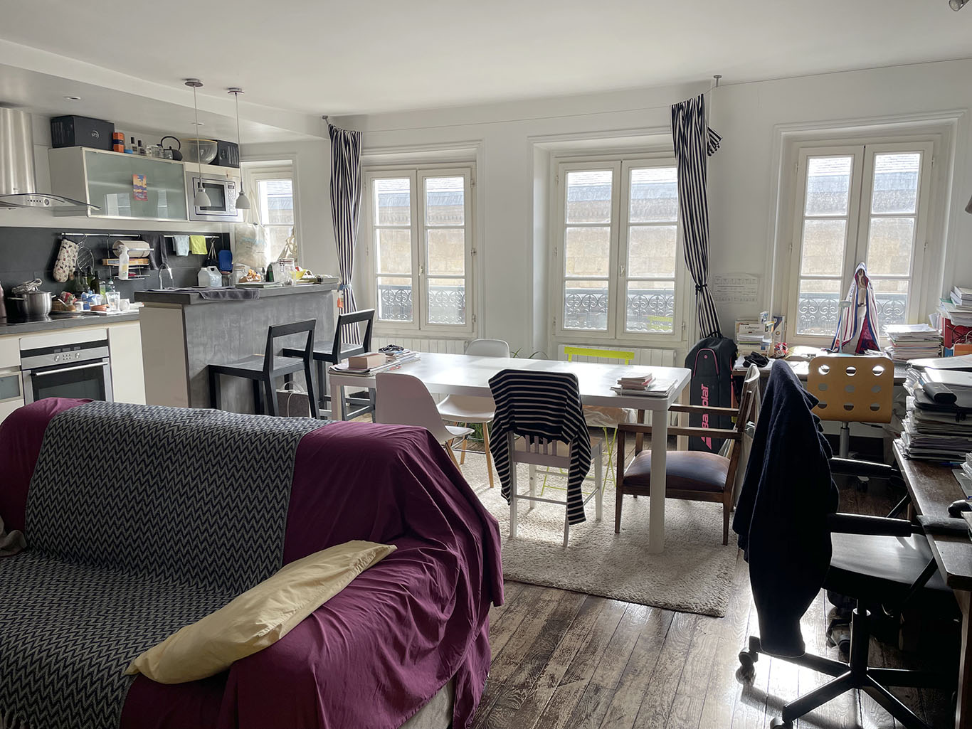 Paris 3ème. Rue Saint-Claude, proche rue de Turenne, très agréable appartement de deux pièces principales de 59,23 m2 Loi Carrez (60,43 m2 au sol). Immeuble du XVIIIème. 4ème étage sans ascenseur. Exposition plein Sud sans vis-à-vis ! Grand séjour avec cuisine Us de 36,87 m2. Chambre côté cour avec petit dressing et salle de bains ouverte. Wc séparés. Cave. DPE : D228 & B9.